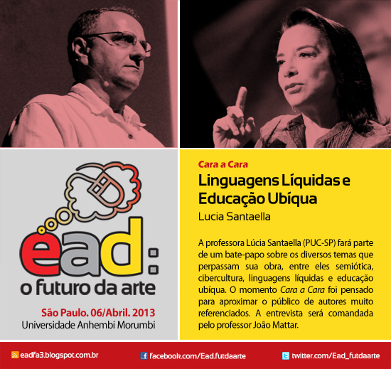 O evento não se resumirá à tradicional modalidade da palestra. Adotará o talk show como forma de socializar o conhecimento. A ideia é promover um cara a cara entre alguns dos maiores pesquisadores brasileiros em tecnologias aplicadas à educação, a exemplo de Lúcia Santaella (PUC-SP e USP), com mais de 30 anos de pesquisa na área de comunicação e semiótica, e João Mattar, um dos maiores especialistas brasileiros em agitação e articulação de redes sociais. Durante o talk show, será feito um retrospecto da carreira de Santaella, com provocações teóricas a respeito de seus principais conceitos como o de linguagem líquida e da possibilidade de, por meio das redes sociais, tornar a educação onipresente.